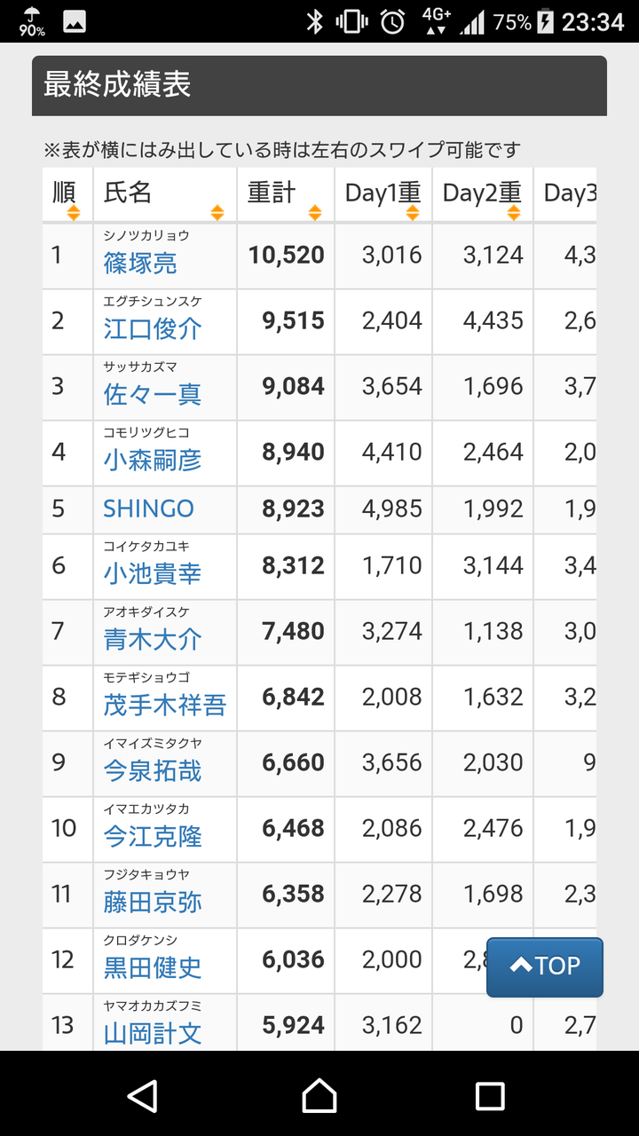 この結果、3日間トータルでは、2日目まで4位につけていた篠塚選手が唯一の10キロ超えでトータル10,520gで優勝。