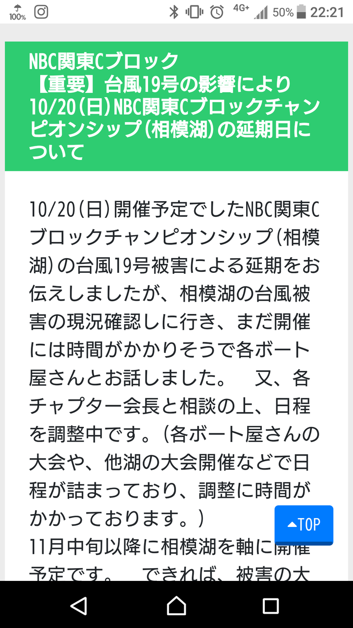 台風19号により、10 /20 ( 日 ) 相模湖開催の関東C ブロックチャンピオンシップ延期日程ですが、日程が調整できましたので下記、日程及び詳細を改めてお伝えします。被害のあった相模湖のボート屋さん復旧に少しでも足しになればと、幹事チャプターをはじめ、各チャプター会長の思いもありますので、日程が遅れた事に、ご了承をお願いします。【参加資格】関東 C ブロック内の各チャプター(東京、神奈川、山中湖、河口湖、ヒューマン富士河口湖校)で2019年各試合上位 30%以内( 小数点切り捨て )【特別枠】主催チャプター枠 : チャプター東京に参加して上記圏内に入ってない選手で、それ以外の年間上位 3名の NBC 選手。【日時】2019年11月24日(日) 6:30~受付(日時訂正)【会場】日相園(ニッソウエン)神奈川県相模原市藤野町日連754042-687-2206【参加費】シニア:3、500円、ジュニア:2,000円【ボート】レンタルボートのみ。会場 日相園他、下記の協力店でレンタルしてください。・日相園 (042-687-2206)・秋川屋 (042-687-2030)・天狗岩 (042-687-2006)・柴田 (070-3660-6363)予約はボートをHPより選び、各自、直接、各ボート店に予約。船外機持込または船外機使用は5馬力まで【ルール】・チャプター東京のローカルルールに準じる↓http://nbctokyo.web.fc2.com/newpage13.htmlデッドスローエリア、禁止エリアが多いので、よく読む事。・プラ制限はしないが、前日プラは16時まで。・大会時の同船不可。・大会の係船時は、フェンダー×2する事。・日相園でレンタルする選手は、先に日相園でボート代を支払って、エントリーカードに「印」をもらってから、受付をする事。・25cm以上、3本リミット【賞品】1-5位び通常表彰以外、6-10位、飛び賞、ブービー賞あり。各チャプターより1社以上の協賛ですので、抽選会等は充実です。協賛メーカー(ルールブック順)東京:海鮮居酒屋 魚々輝(トトキ)様神奈川:アングラーズハウス ヤマキ様山中湖:松本釣具店様、センターフィールド様河口湖:GENKI様ヒューマン富士河口湖校:ジャクソン様、SABUROKU様協賛、各位に感謝いたします!【大会予約】出場権のある参加希望選手は、大会一週間前の11/21(木)までに下記幹事に参加申し込みをメールでする事。http://nbc-tokyo.com/entry_kanto_c/index のフォームに(名前)、内容に権利取得ブチャプター(第〇戦)、ゼッケン、名前、携帯番号を記入する事。又、返信メールに 相模湖案内図を折り返し送りますので(フォームの返信メールとは別におくります)PDFファイルが受信できる、PC等のメルアドを明記してください。尚、すでに申し込みをしている選手は再送しなくて結構です。欠場する選手のみ、金井会長にキャンセルのメールをして下さい。※前日、当日キャンセルはボート代キャンセル料を頂きます当日受付も可としますが、全予約者スタート後となります。人数把握と賞品買いだし等の為、ご協力をお願いします。質問等も、幹事にメールでお願いします。【チャンピオンシップ東日本決勝 出場権】今回、災害特例としてNBC本部、東日本の各ブロック長の許可を得まして、11/10桧原湖での決勝戦を過ぎてしまうので、来年の関東Aブロック開催湖での出場権に振り替えさせていただきました。桧原湖戦を楽しみにしていた選手も多いとは思いますが、ご了承をお願いします。【幹事】関東Cブロック ブロック長 大場(大会委員長):kawacyapu2018@yahoo.co.jpチャプター東京 会長 金井(ホストチャプター):info@nbc-tokyo.com