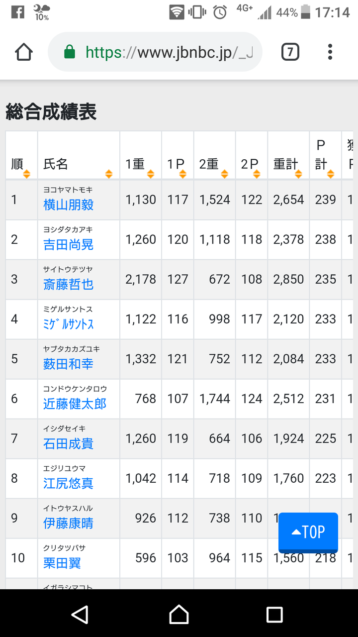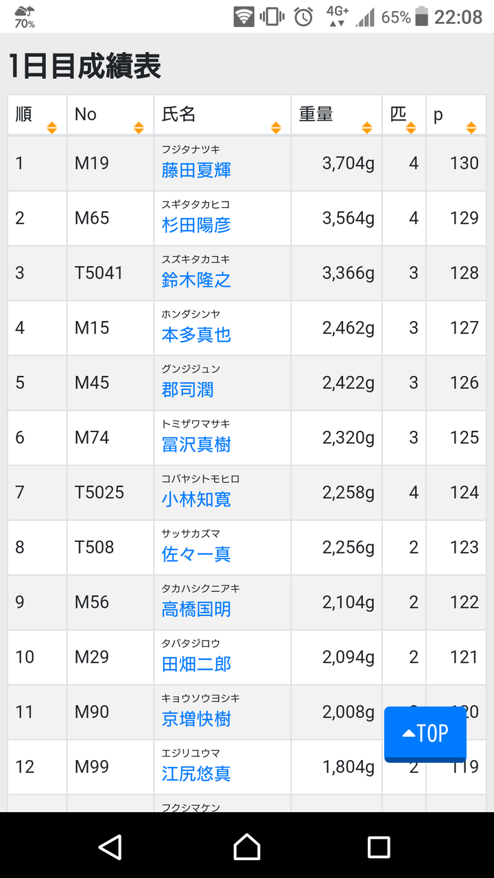 2位は元トップ50の藤田夏輝選手が2,792g、3位は元トップ50の小林翼選手が2,766g、4位は山下尚輝選手が2,332g,5位は中島慎二選手が2,172gとなりました。