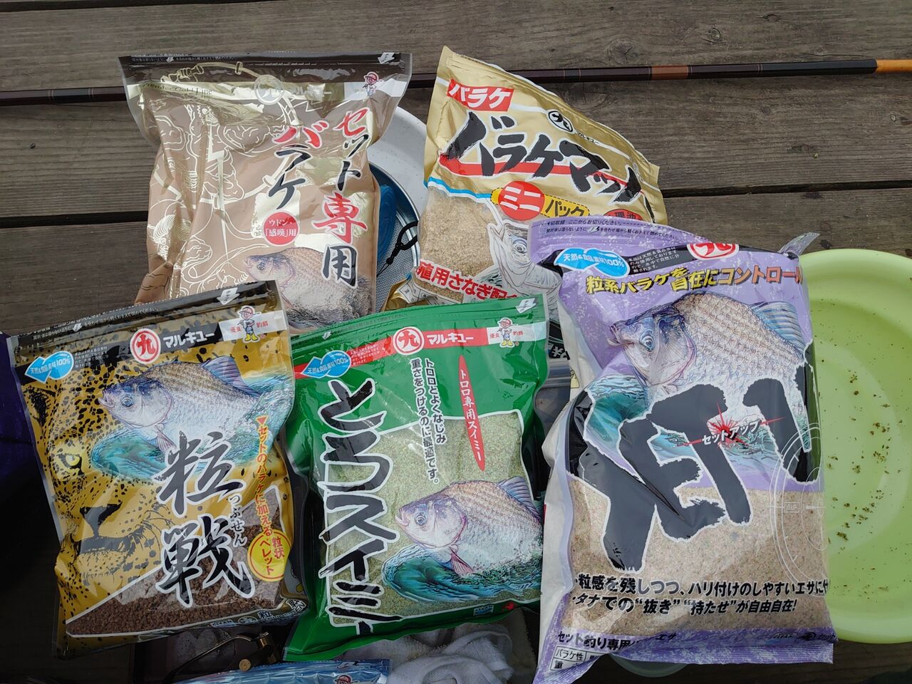 粒戦 100cc、とろスイミー 50cc、水 200cc、セットアップ 100cc、セット専用バラケ 100cc、バラケマッハ 100cc 餌量 225cc、水量 100cc(当日)