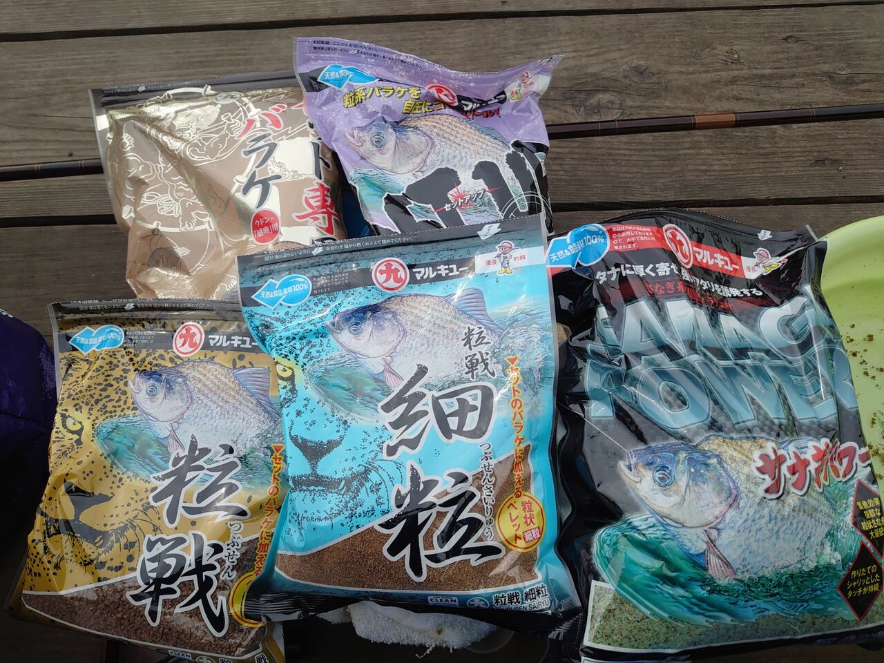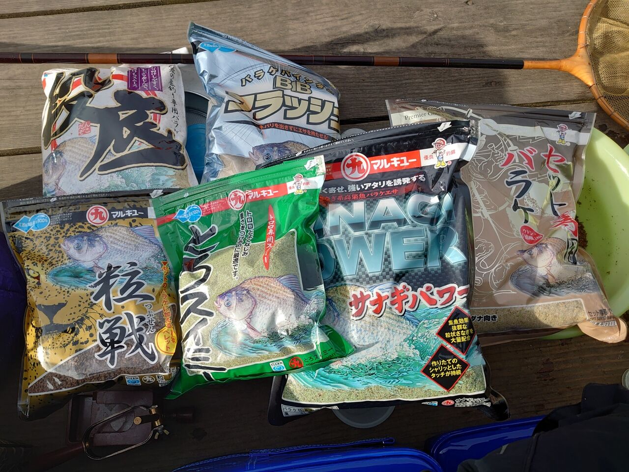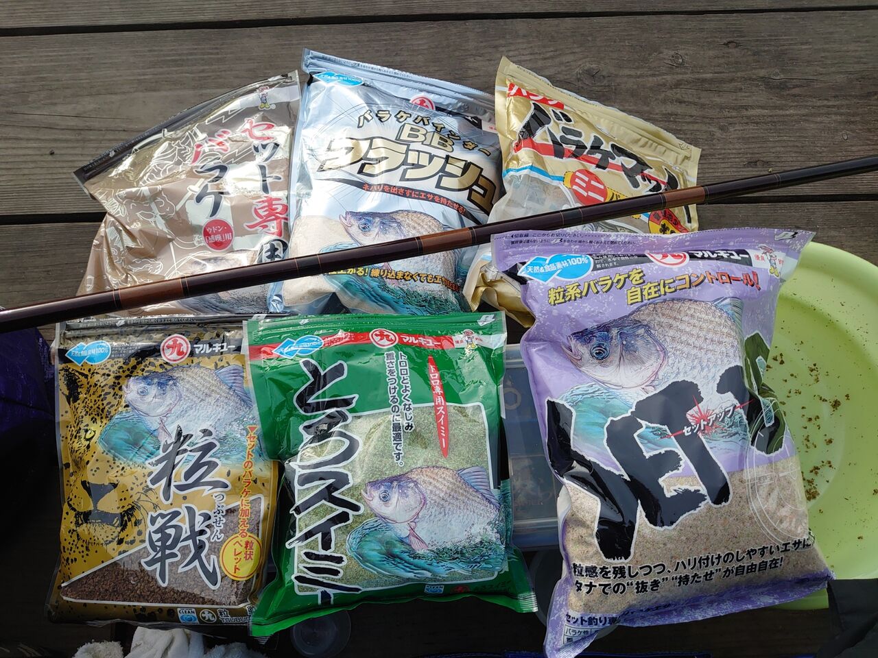 粒戦 100cc、粒戦細粒 50cc、さなぎパワー 100cc、水 150cc、セットアップ 100cc、セット専用バラケ 100cc 餌量 225cc、水量 75cc(当日)